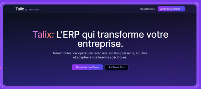 Talix voulait créer un ERP moderne, accessible et abordable pour les PME. L'objectif était de proposer une alternative aux solutions complexes et coûteuses du marché, sans compromis sur les fonctionnalités.